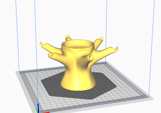 The image set below demonstrates the difference between “normal” supports and “tree” supports. The first image shows the model before supports have been generated; the second image shows the model with normal supports; the final image shows the model with tree supports.